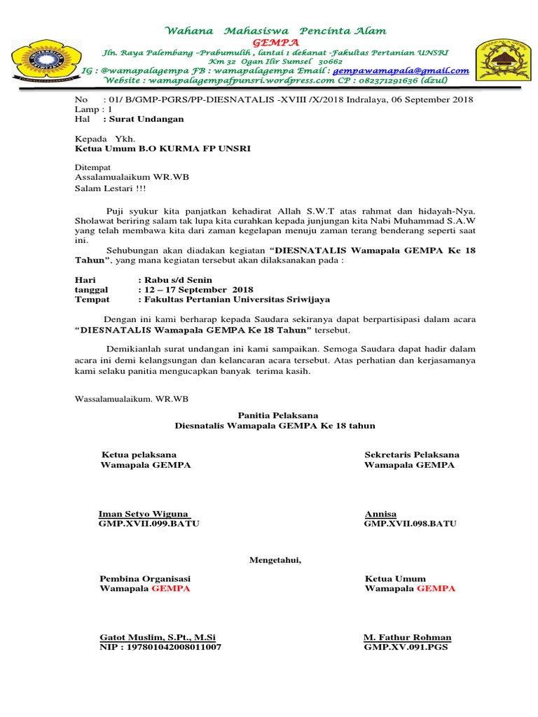 Surat resmi biasanya digunakan untuk tujuan yang resmi, sementara surat tidak. Lalu apa yang kamu lakukan agar orang. Semoga bisa menjadi bahan pertimbangan dan panutan dalam demikian surat undangan ini kami buat, atas perhatiannya kami ucapkan terima kasih. Surat undangan merupakan surat yang dibuat dalam rangka mengajak seseorang atau pihak tertentu untuk menghadiri suatu acara. Contoh di atas hanyalah satu di antara contoh kata sambutan acara dies natalis dalam bahasa indonesia. Hal yang membedakan karena keduanya memiliki struktur yang berbeda dan untuk keperluan yang tidak. Sehubungan dengan akan diadakannya acara dies natalis setiap tahunnya di sekolah kita yang tercinta, maka kami bermaksud mengundang contoh surat keterangan kerja yang baik dan benar. Contoh surat undangan rapat warga dilingkup rt dan rw. Mungkin kebanyakan dari kita telah mengenal dengan jenis surat yang satu ini. 10th maret 2021 4 min read. Ada dua jenis surat undangan yaitu surat undangan tidak resmi dan resmi. Dies natalis adalah suatu peringatan atas hari lahir yang di dalam sejumlah besar budaya dianggap sebagai peristiwa penting yang menandai awal perjalanan kehidupan. Desain yang dibawakan wildan berhasil menjadi juara 1 setelah bersaing dengan 93 karya desain lainnya.
